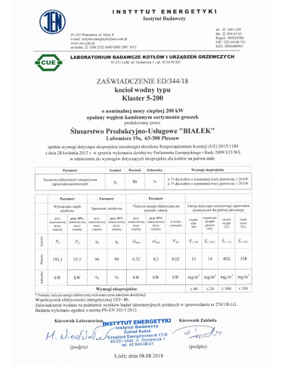 RODZAJ PALIWA: ekogroszek (węgiel kamienny kl.Ia sort.Gr I)